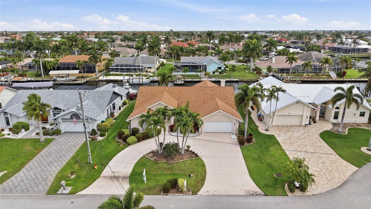 DIRECT GULF ACCESS, MINUTES TO OPEN WATER, POOL HOME, AND WALKING DISTANCE TO CAPE HARBOUR Welcome to your slice of waterfront paradise with NO BRIDGES and direct Gulf access, perfectly positioned on a wide canal and just minutes by boat to open water. This prime location offers the best of both worlds with a short walk to Cape Harbour's dining, shopping, and marina lifestyle, as well as nearby grocery stores, restaurants, and everyday conveniences. This custom built, one owner home offers 2,674 square feet under air with 3 bedrooms, 2 bathrooms plus a separate pool bath, offering both space and functionality . A circular driveway, lush white rock landscaping, and double entry French doors create a stunning first impression. Inside, you will find soaring and vaulted ceilings, tile flooring throughout, and an open, light filled layout featuring two spacious living areas, a real stone wood burning fireplace, and two dining spaces perfect for hosting or creating a cozy breakfast nook. The updated kitchen showcases quartz and granite style countertops, white appliances, an extra large refrigerator and freezer, electric KitchenAid cooktop, and double wall ovens, making it ideal for everyday living and entertaining. The primary suite is a private retreat with sliding doors to the lanai, two walk in closets, and a spa like bathroom featuring dual sinks, a makeup vanity, oversized shower, and a jetted soaking tub. Function meets convenience with a huge laundry room complete with quartz countertops, upper and lower cabinetry, backsplash, sink, and newer Whirlpool washer and dryer. The finished garage includes built in cabinets and workbenches for additional storage and functionality. Designed for true indoor outdoor living, pocket sliding glass doors open the home completely to the covered lanai, where you will find electric fabric shutters, a newly installed pool enclosure, a pebble finished patio, outdoor shower, and a dedicated pool bath for seamless entertaining. Additional upgrades include a newer roof completed in 2023, updated two zone AC systems, fresh interior paint, updated guest bathroom, and new carpet in guest bedrooms. The home is fully equipped with extensive hurricane protection including shutters and accordion panels for added peace of mind. With no history of flooding, a concrete cantilever dock already in place, and space to design your ideal lift or boating setup, this property is truly a boater's dream and a rare opportunity to create your ideal waterfront lifestyle in one of Southwest Cape Coral's most desirable locations.
